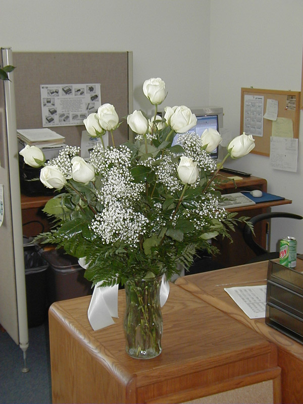 From me for Brian we have . . . one dozen (actually a baker's dozen) white long-stemmed roses delivered to his office. I haven't done that since I went to Colombia on business around Valentine's Day in 1997. As a result, I figured he was due to receive more-- no, the other arrangement that I had sent has long since disappeared.