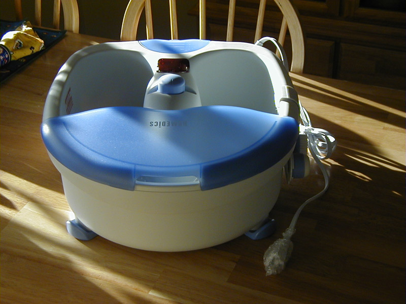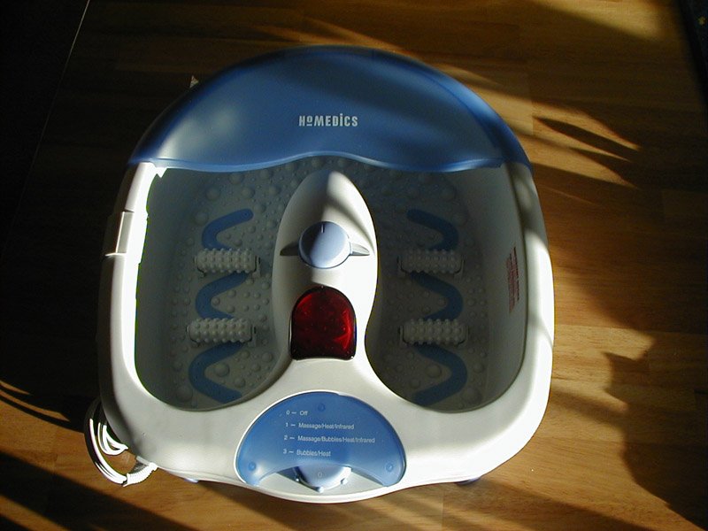 From Brian for me we have . . . a foot spa!! Yes, he has definitely out-done himself in the romance department, hasn't he? It really works as a romance gift for me because he knows I hate when my feet get rough because I wear sandals all the time in the summer. Look at the inside of this puppy-- its got rollers and bubble jets under my feet!!