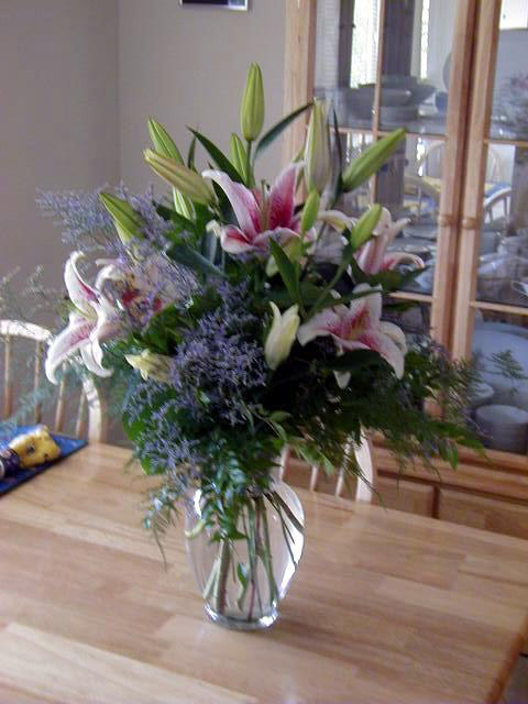 A little while later, one of the maintenance sales reps was in my office and we were talking. He and I both heard a commotion in the hallway-- Heather, one of the administrators was having to tell people to back-off-- "They're for Marcia!" Huh?? What was for Marcia? The maintenance sales rep looked at me and started grinning, "I believe you have flowers arriving!" and sure enough, there was a huge bouquet of the most beautiful Stargazer Lilies!!