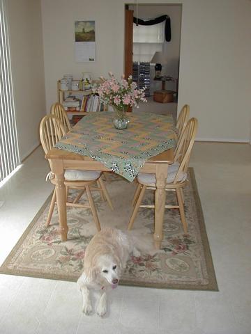 Not only do you get to see the most adorable dog in the world looking her extremely royal self BUT you get to see a really pretty tablecloth, too!! The tablecloth is the simple, "beginner" design that I'm going to use for my class in September or October. So, if you live in Maryland and are interested in a quilting class, keep that in mind and watch this site for the announcement of the class dates. I'll have another angle shot or two on the quilting page eventually but I had to share the above shot with you today.